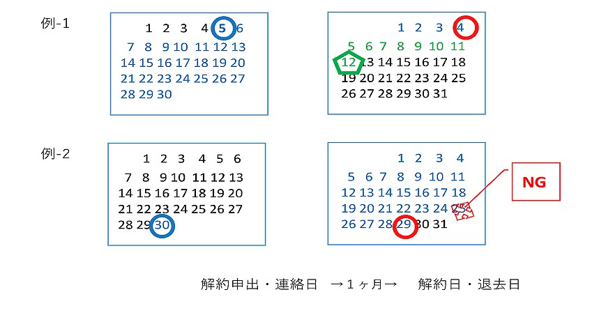 例-1図 〇月5日に連絡・受理⇒1ヶ月後の翌月4日が最短での解約日となります。